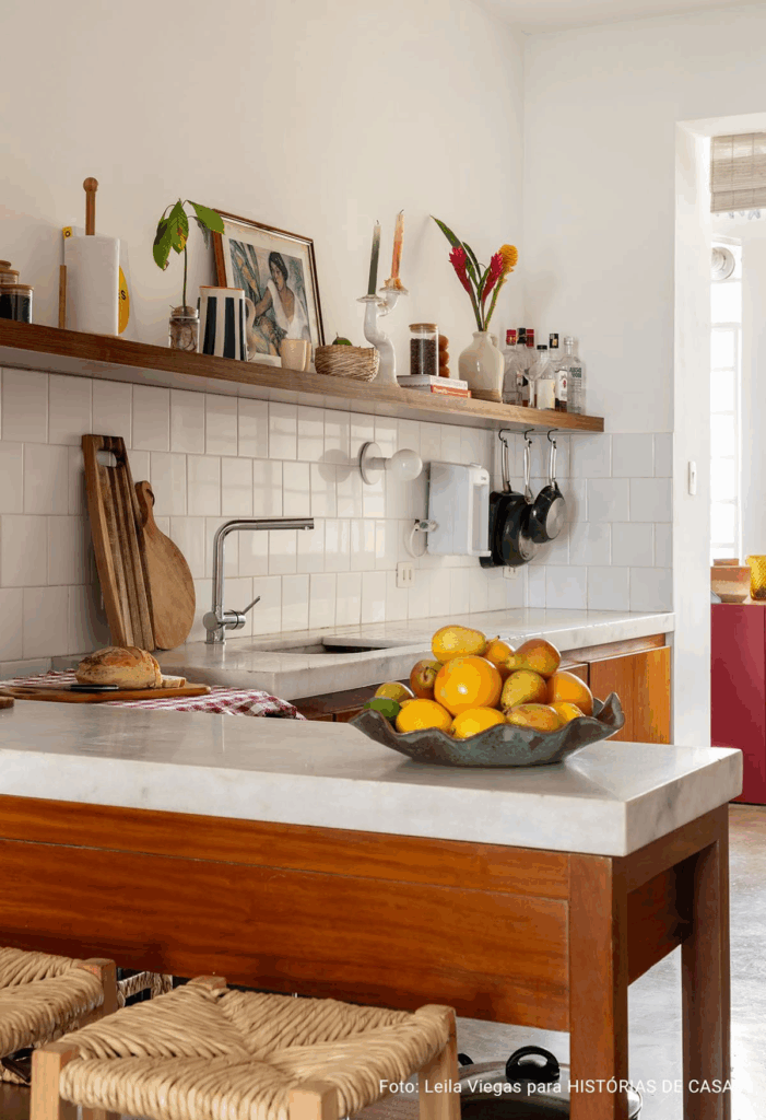 Além de práticas, as prateleiras abertas deixam utensílios e temperos à vista, servindo como parte da decoração. Organize potes de vidro, canecas e até plantas pequenas para criar um visual aconchegante.