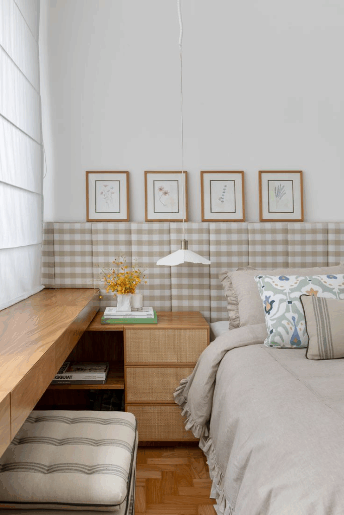 Se não quiser investir em uma cama com cabeceira, use alternativas como painéis de madeira, adesivos de parede ou até uma pintura geométrica atrás da cama. Isso valoriza o espaço com pouco gasto.