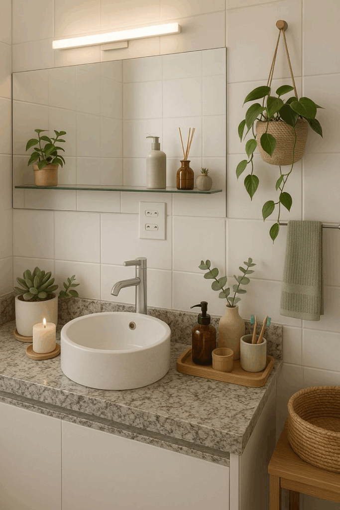 Colocar plantas no banheiro é uma forma simples de trazer vida ao espaço. Espécies como espada-de-são-jorge e zamioculca resistem bem à umidade e dão um toque sofisticado ao ambiente.