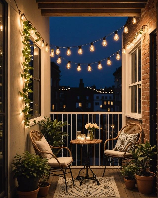 Cordões de luz (pisca-piscas ou luminárias de LED) são baratos e criam um clima acolhedor. Combine com algumas almofadas e tapetes para transformar sua varanda em um cantinho especial.