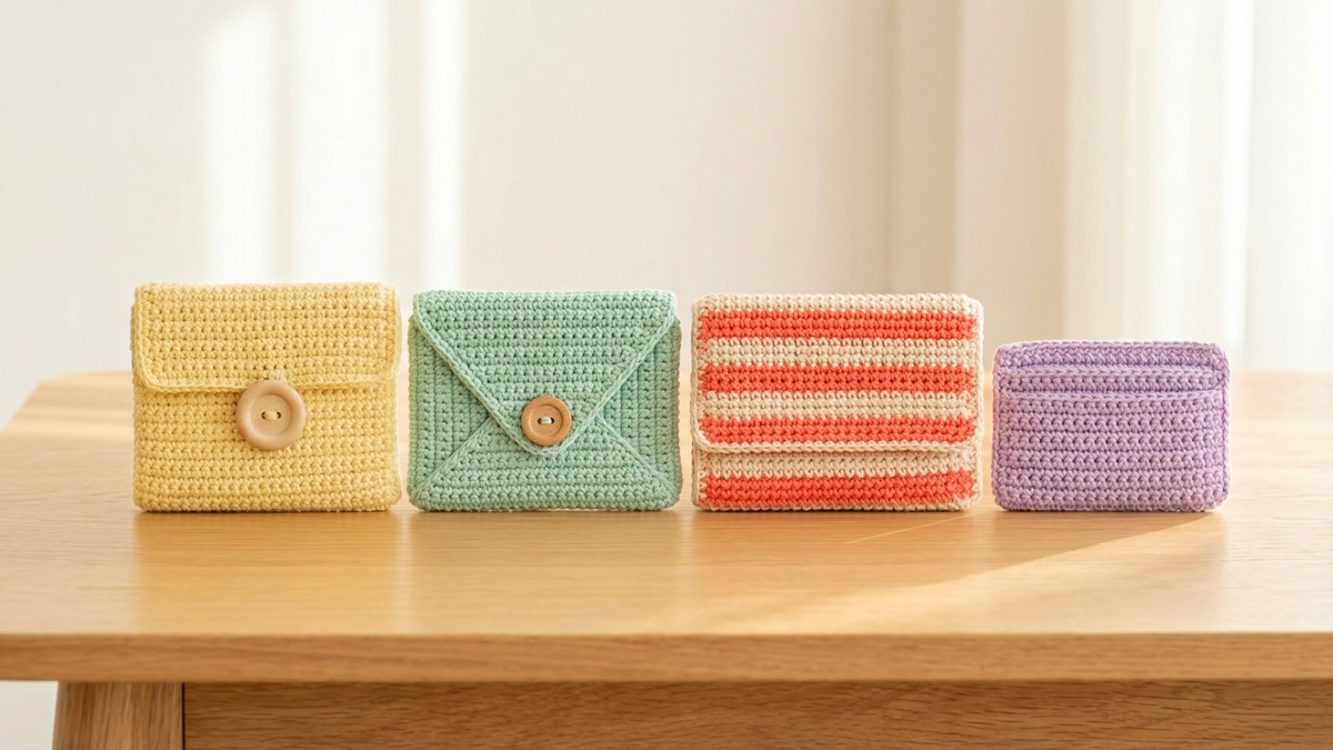 A seguir, você encontra 4 ideias de modelos de carteiras de crochê com ponto fácil, todos pensados para serem possíveis com pontos básicos. Use as ideias como “base” para criar suas próprias variações de cor, tamanho e detalhe.
