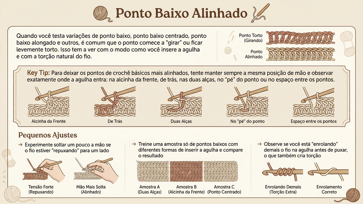 Quando você começa a testar novos pontos de crochê, um dos problemas mais comuns é a peça ir afinando, alargando ou entortando sem que você perceba. Isso acontece porque cada combinação de ponto muda o jeito de contar as bases e as laterais da carreira.