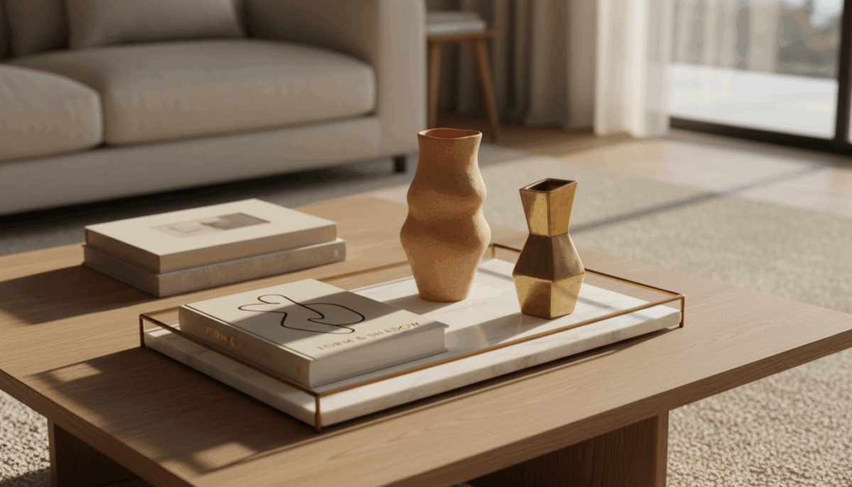 - Monte uma vinheta com 3 alturas: livro (baixo) + vaso (médio) + objeto de metal ou vela (alto), formando um triângulo visual sobre uma bandeja.
