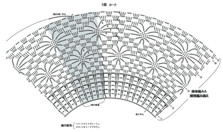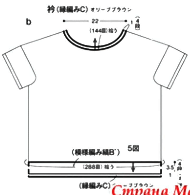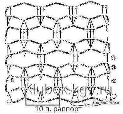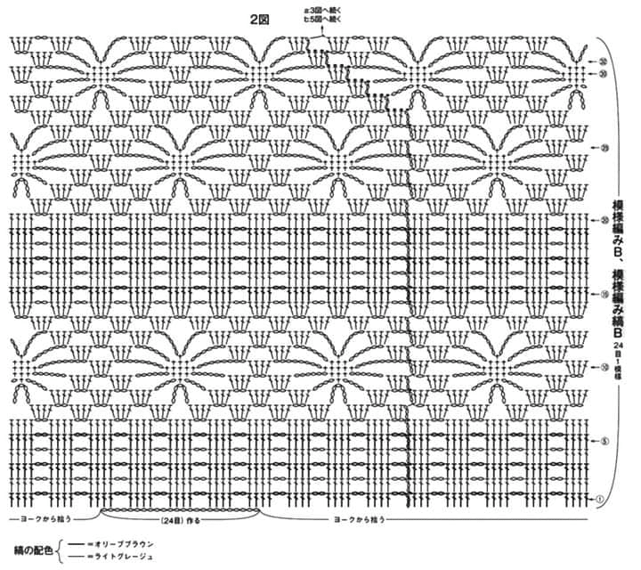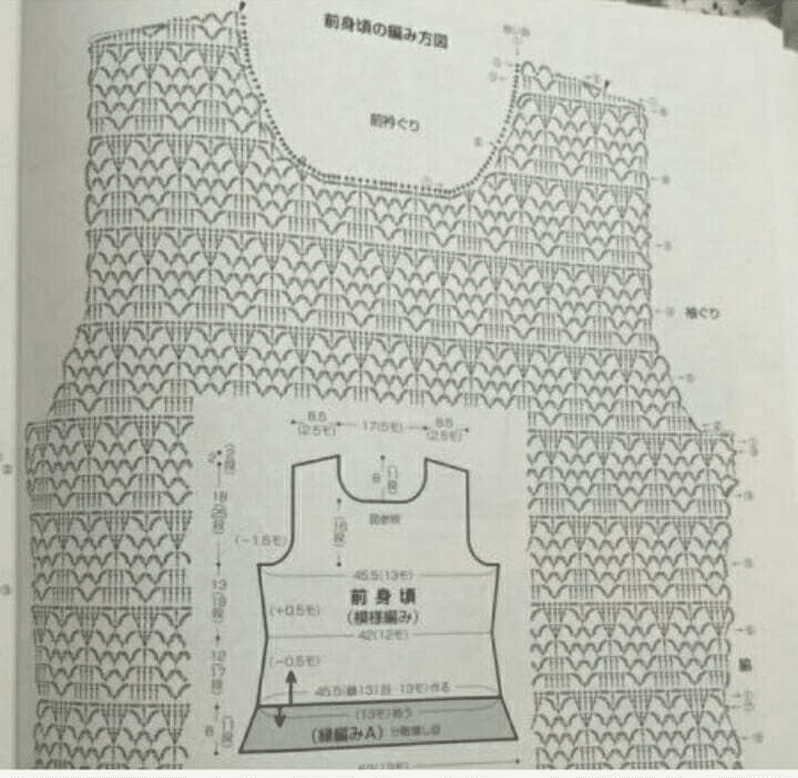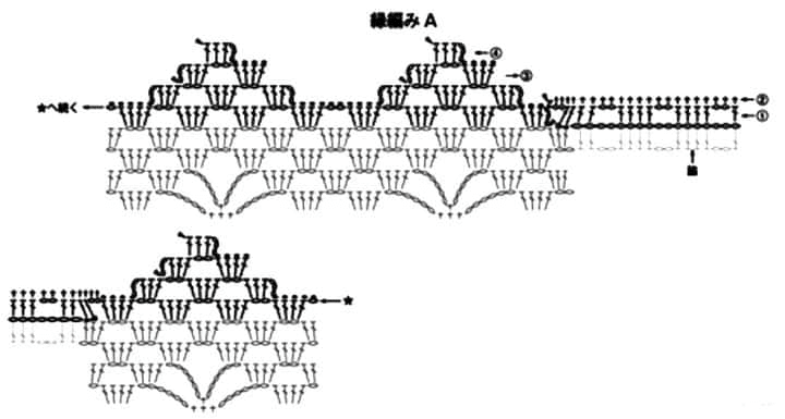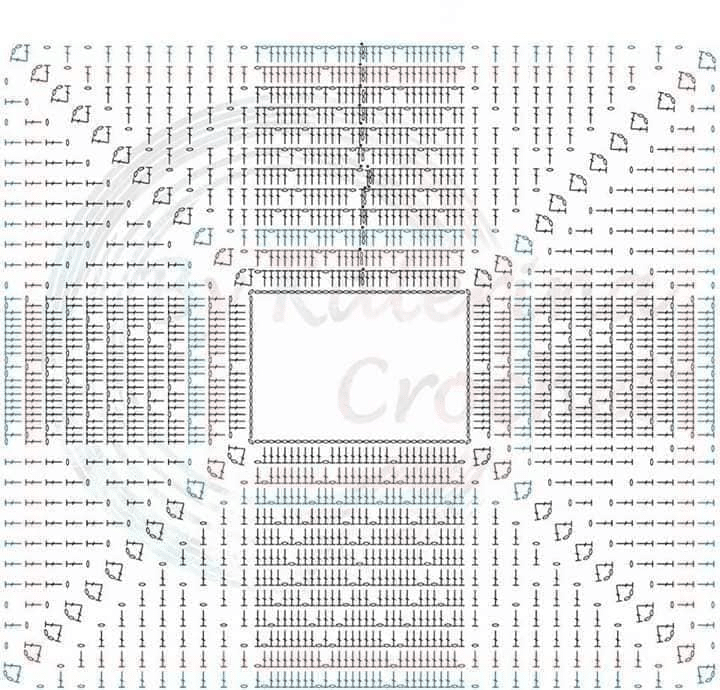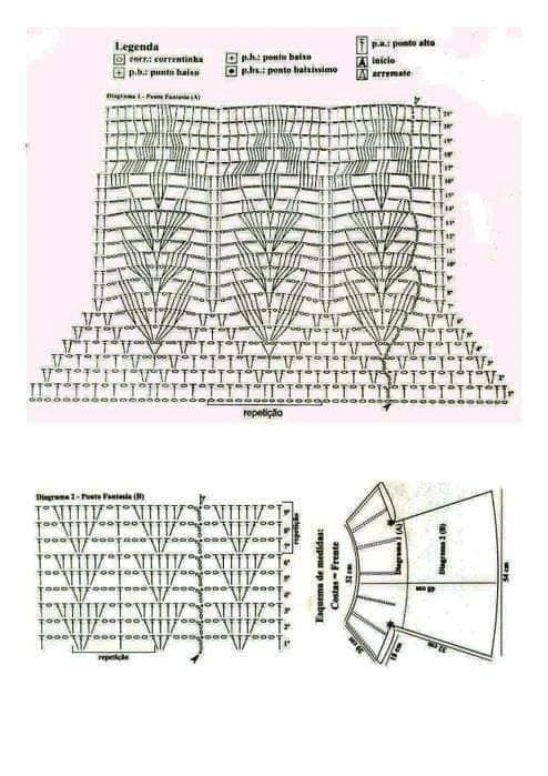 Frente e Costas – São iguais e trabalhadas juntas. Faça uma corr. de 280 p. feche em círculo e trabalhe em p. fantasia seguindo o gráfico, repita de * a * no sentido dos p. (20 v.). A 26 cm do início, divida o trabalho em duas partes iguais e trabalhe cada lado separadamente.