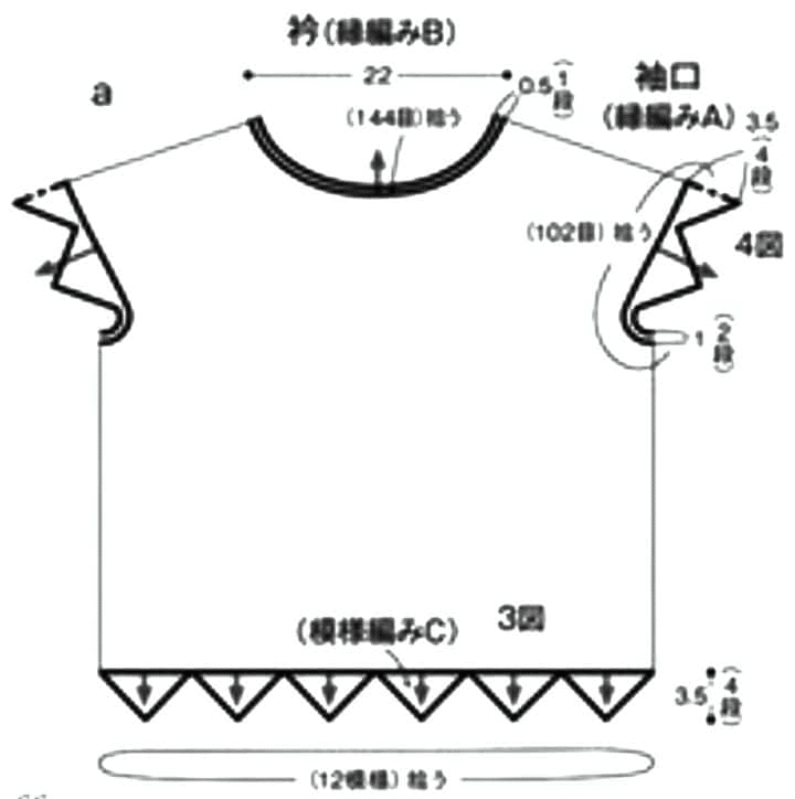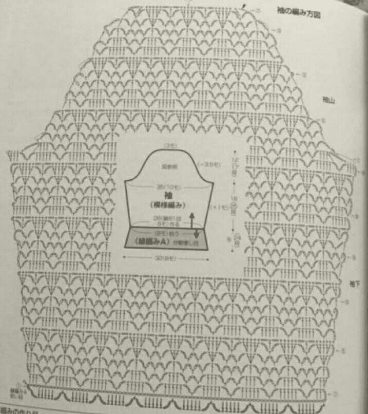 Frente – Trabalhe igual as costas. Mangas – Faça uma corr. de 119 p. feche em círculo e trabalhe em p. fantasia seguindo o gráfico, repita de * a * no sentido dos p. (9 v.). A 42 cm do início, para a cava trabalhe em carr. de ida e volta. Deixe de fazer de cada lado em cada carr.: 2 p. (14 v.). A 50 cm do início do trabalho rem..