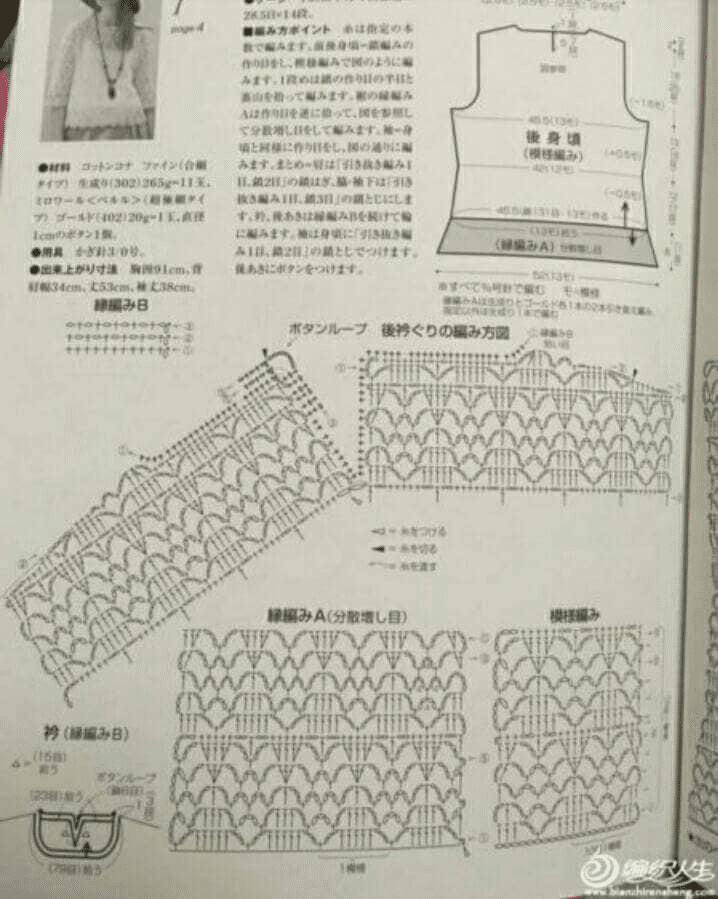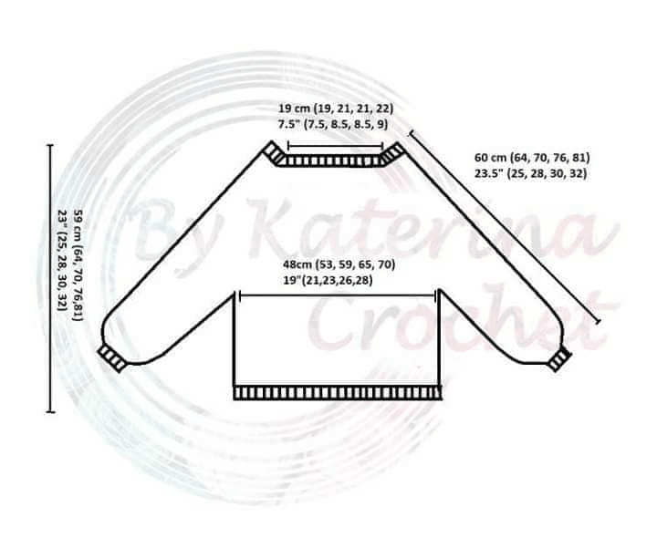 Frente e Costas – São iguais e trabalhadas juntas. Faça uma corr. de 280 p. feche em círculo e trabalhe em p. fantasia seguindo o gráfico, repita de * a * no sentido dos p. (20 v.). A 26 cm do início, divida o trabalho em duas partes iguais e trabalhe cada lado separadamente. Costas – Em metade do trabalho, trab. as costas, deixe de fazer para as cavas de cada lado em cada carr.: 3 p. e 2 p. (2 v.). A 39 cm do início do trabalho para o decote deixe de fazer os 48 p. centrais e trabalhe cada lado separadamente, deixe de fazer do lado do decote em cada carr.: 5 p. (3 v.). A 42 cm do início do trabalho rem.. Trabalhe o outro lado igual. Frente – Trabalhe igual as costas. Mangas – Faça uma corr. de 119 p. feche em círculo e trabalhe em p. fantasia seguindo o gráfico, repita de * a * no sentido dos p. (9 v.). A 42 cm do início, para a cava trabalhe em carr. de ida e volta. Deixe de fazer de cada lado em cada carr.: 2 p. (14 v.). A 50 cm do início do trabalho rem..
