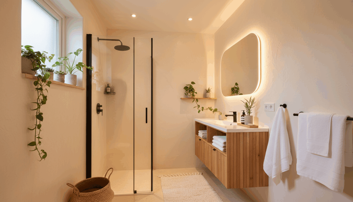 - Tinta epóxi quente sobre azulejo, trocar apenas metais e espelho, aplicar fitas led IP65 em nichos e rodabanca, adesivo vinílico fosco na parede de destaque, cestos/fibras/linho para textura imediata. Um tapete felpudo bege e toalhas em tom natural já aquecem o cenário.