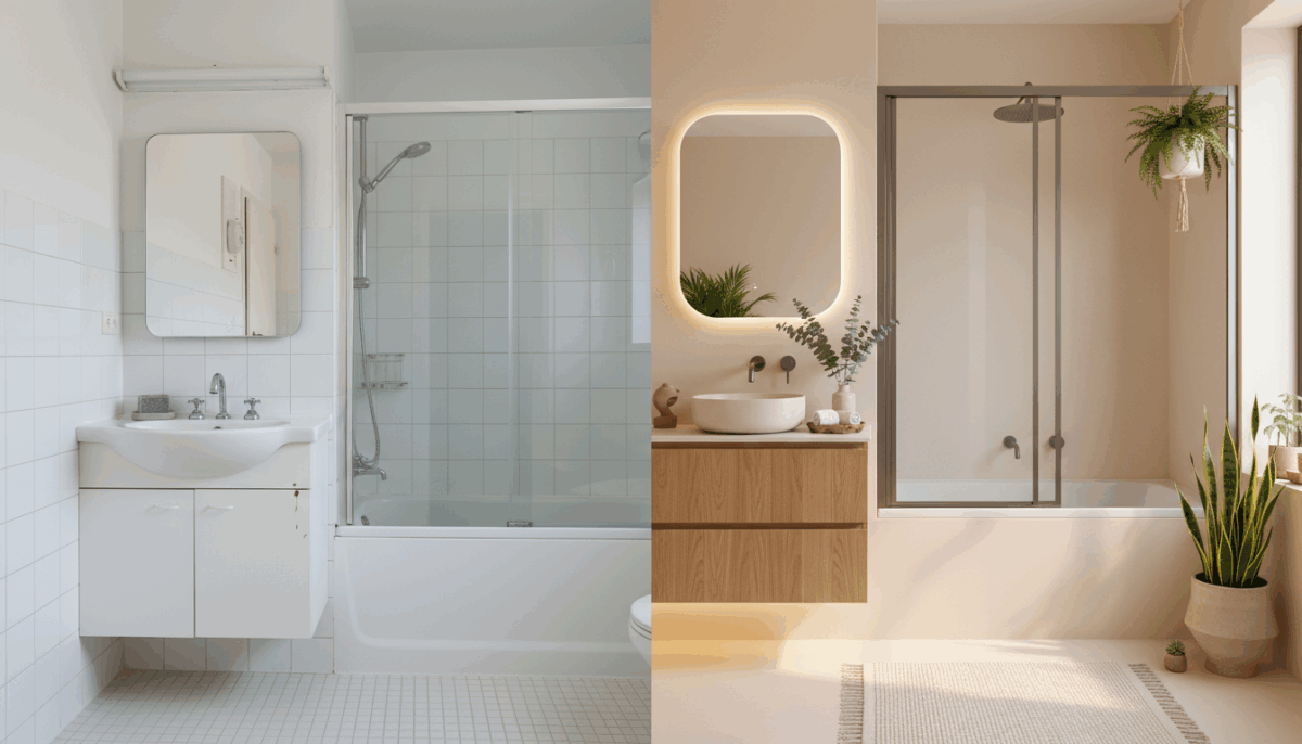 Banheiro pequeno (apartamento): pinte azulejo com epóxi off-white quente, troque o espelho por um oval iluminado, gabinete com porta ripada e puxador cava, tapete de algodão texturizado e uma planta resistente (espada-de-São-Jorge).