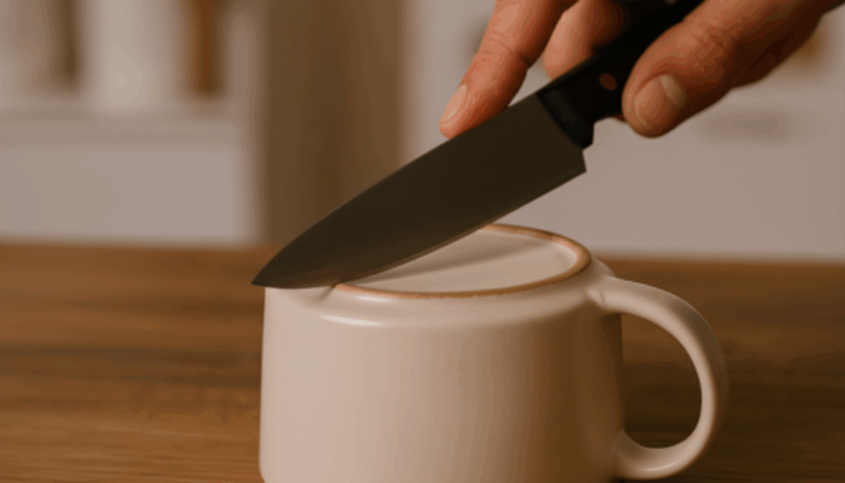 Afiar faca não precisa de afiador profissional — e muito menos de força. Um truque simples e surpreendentemente eficaz envolve um item que todo mundo tem em casa: o fundo da xícara de cerâmica. Essa parte áspera funciona como uma mini pedra de amolar.