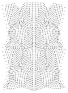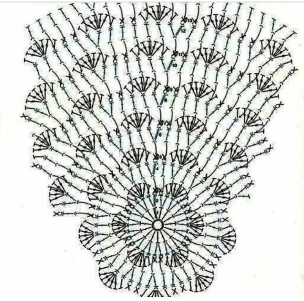 1ª carr.: (essa carr. ficará no avesso da peça) volte trab. a partir da 4ª corr. a contar da ag. com 2 p.a. *1 corr. pule 3 pts.de base, 4 p.a. no mesmo p. de base, 1 corr. pule 3 pts. de base, 5 p.a., * rep. de *a* até o final da carr. finalize com 3 p.a.