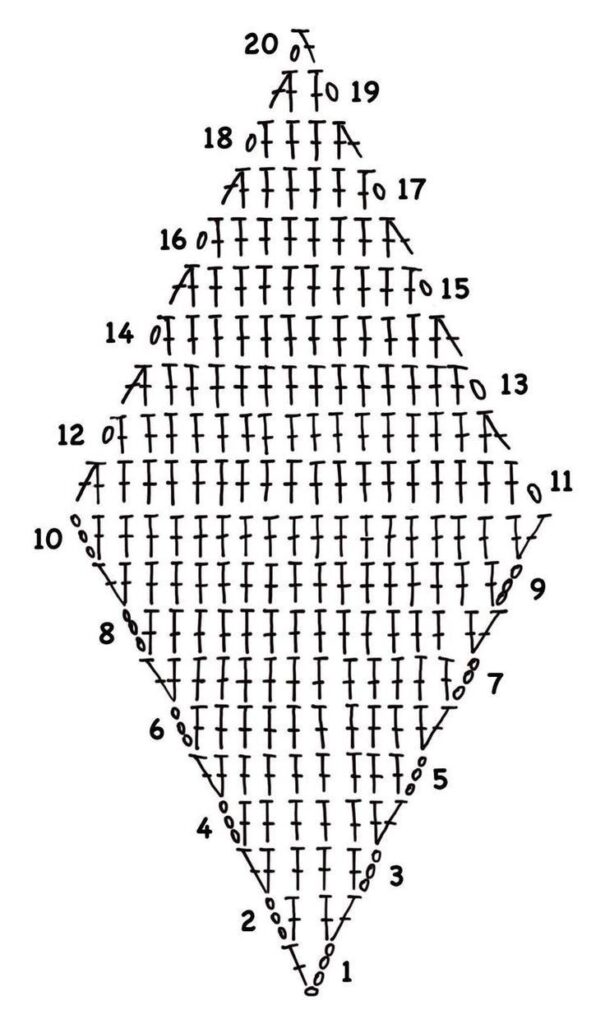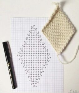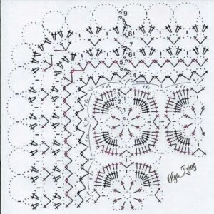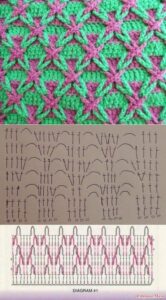 Abreviações: p. (Ponto), pts. (pontos), trab. (trabalhe ou trabalhando), ag. (agulha), rep. (repetição ou repetições), rem. (rematar), acomp. (acompanhando), corr. (Correntinha), p.b.x. (Ponto Baixíssimo), carr. (Carreira); laç. (Laçada); p.a. (Ponto Alto); p.b. (Ponto Baixo), p.a.r.f. (Ponto Alto em relevo pegando pela frente)