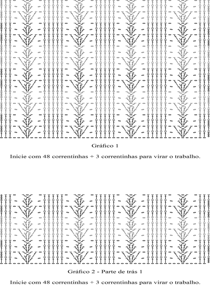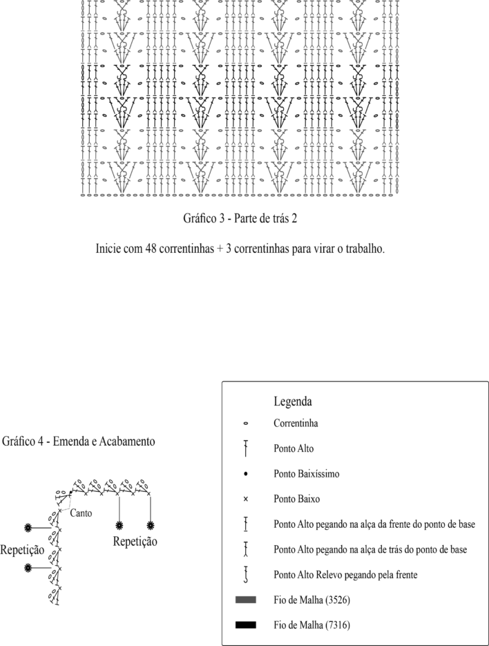Pontos Utilizados: corr. (Correntinha); p.b.x. (Ponto Baixíssimo); p.a. (Ponto Alto); p.b. (Ponto Baixo), p.a.r.f. (Ponto Alto em relevo pegando pela frente)