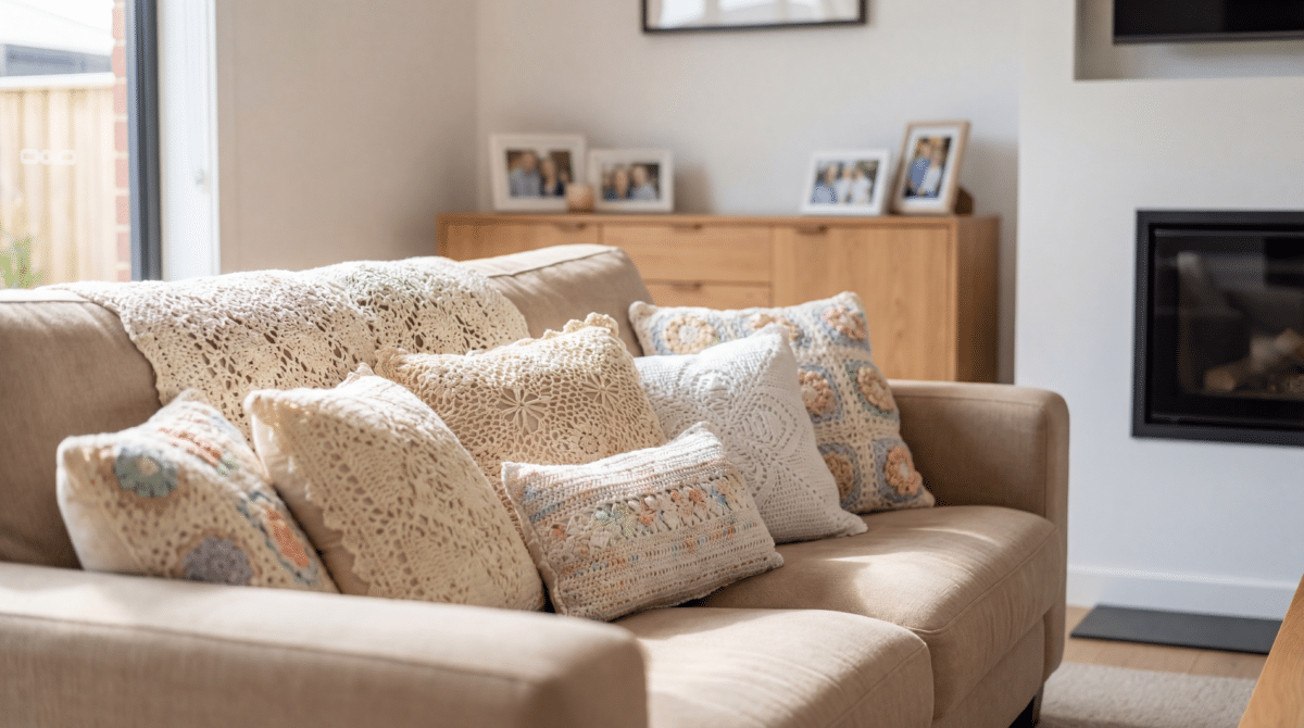 - Dica Estratégica: Use uma almofada de granny square como a única peça colorida de destaque no meio de almofadas lisas.