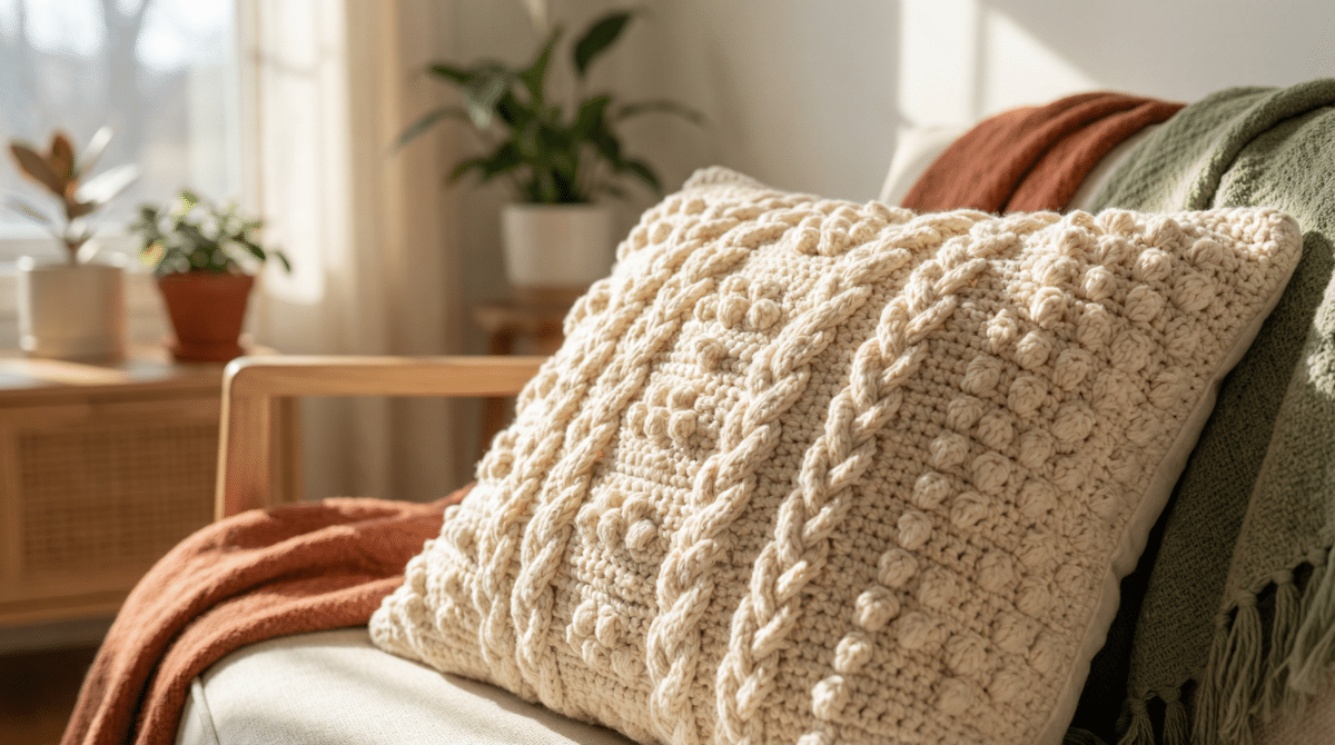 Posso misturar crochê com outros tecidos na mesma almofada? Sim! Uma tendência forte é ter a frente em crochê e o verso em tecido como linho ou veludo. Esta técnica torna a produção mais rápida e confere um aspeto de design de luxo híbrido muito apreciado na decoração atual.