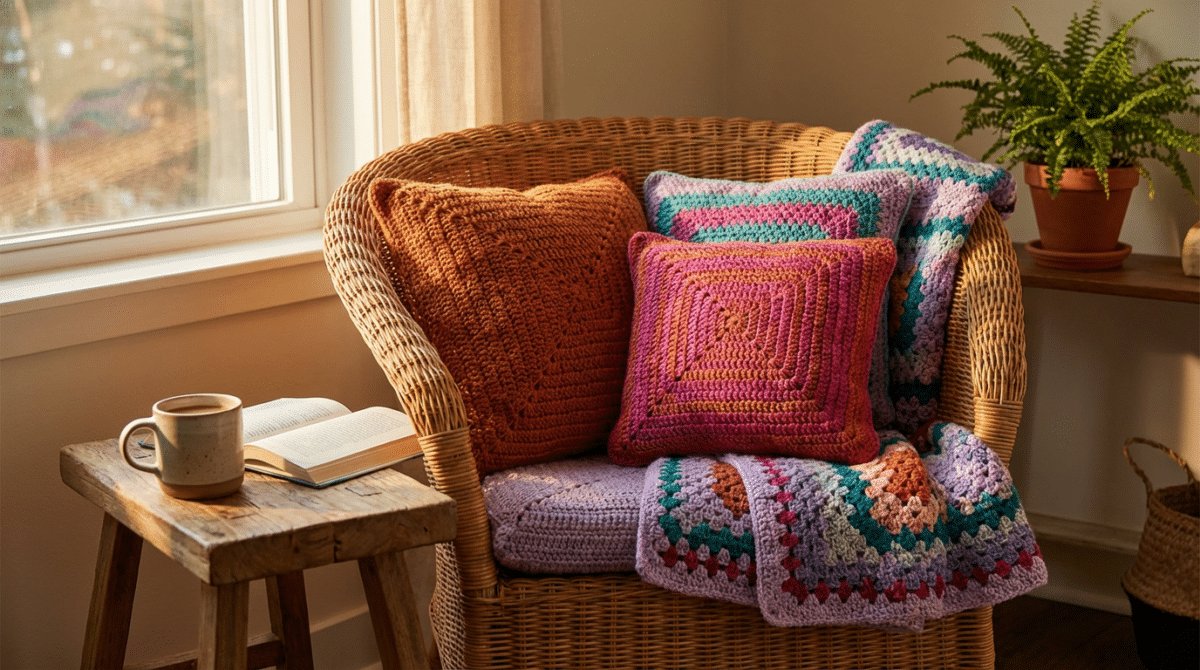 As almofadas de crochê ficam lindas no sofá da sala, mas podem ir muito além disso. Em poltronas, bancos de madeira, cadeiras de leitura e até no chão, elas criam cantinhos aconchegantes sem precisar de móveis novos.