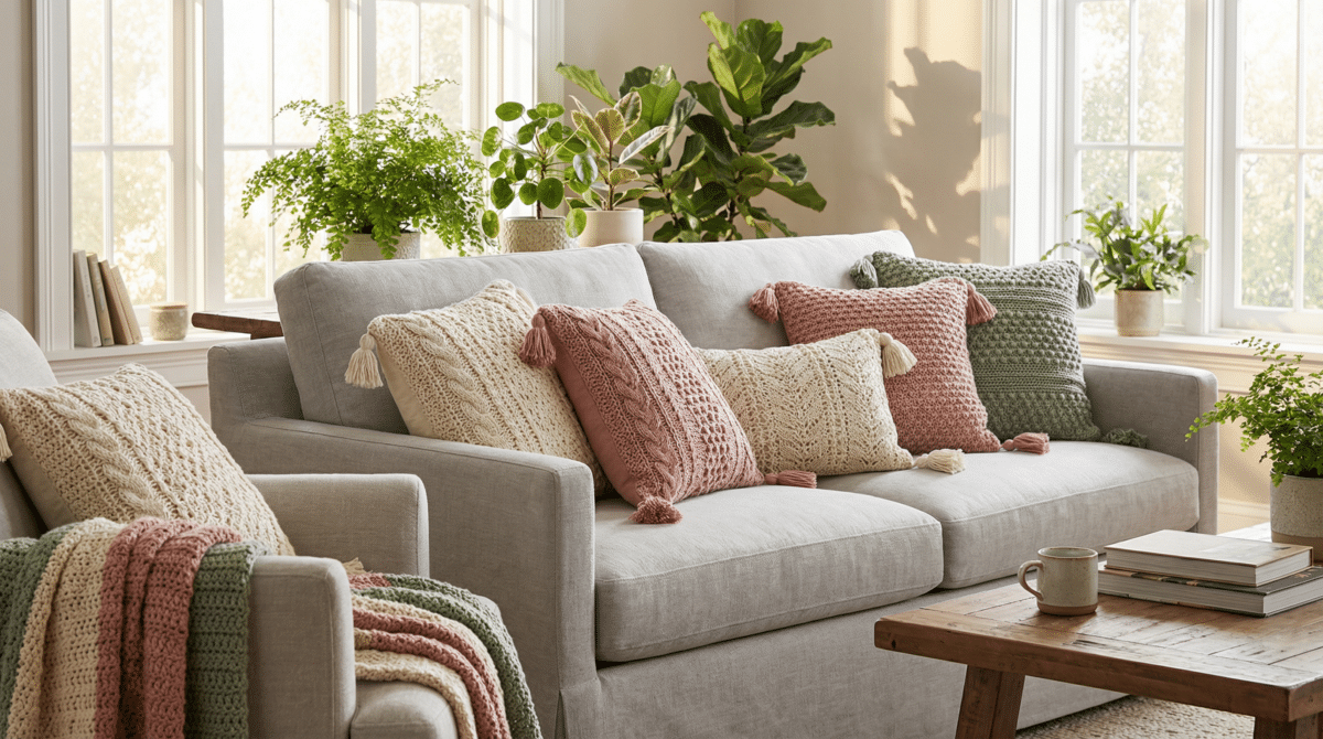 A tendência do Comfy Decor (decoração confortável) busca criar espaços que abraçam o morador. As almofadas de crochê são as embaixadoras desse estilo. Elas oferecem o que os designers chamam de contraste sensorial: o toque macio do algodão contra a rigidez da madeira ou o frescor do couro.