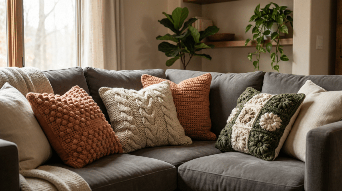 Um dos erros mais comuns é usar apenas itens de um único material. A regra de ouro dos designers para 2025 é o contraste: combine o crochê com tecidos lisos e tecnológicos. Uma almofada de crochê robusta fica impecável ao lado de almofadas de linho, veludo ou até mesmo couro.