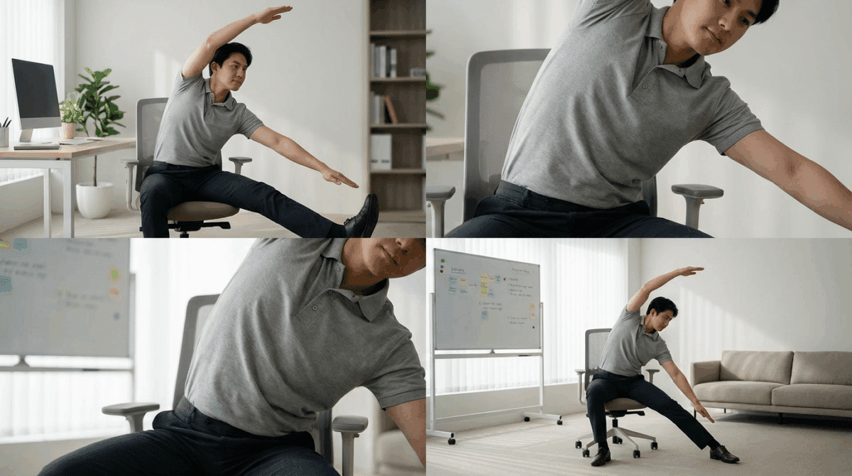 A ideia não é “malhar” — é apenas tirar o corpo do modo estático por alguns segundos. Esse pequeno intervalo já melhora a circulação, acorda a postura e reduz a pressão acumulada na lombar.