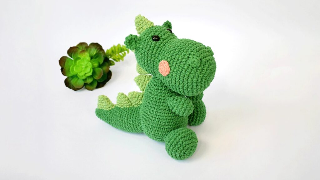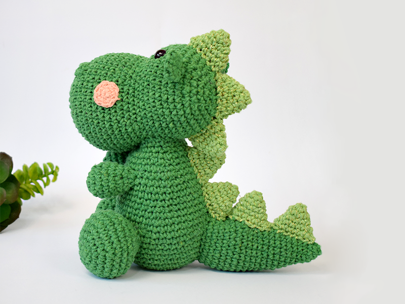 - Detalhes: Para as bochechas e espinhos do dinossauro, utilize fios de cor distinta para dar destaque à textura. Costure todos os componentes ao corpo e à cabeça cuidadosamente.