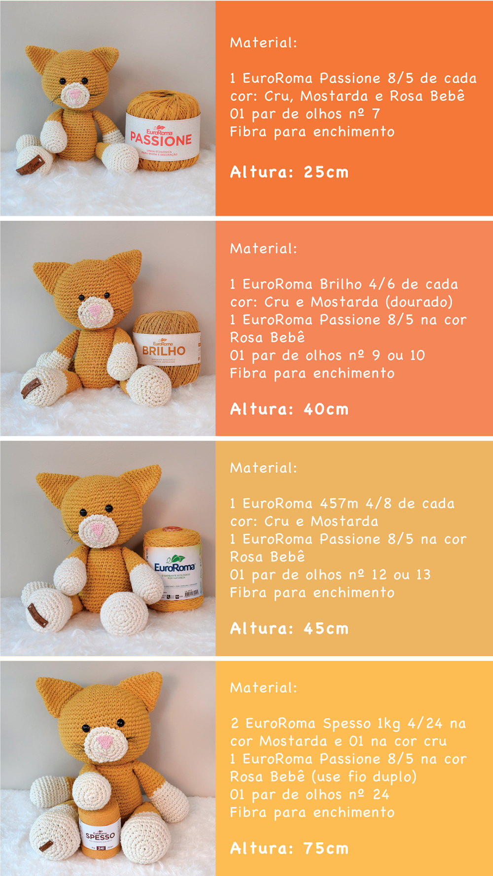 Pirei com esta receita de todos os tamanhos do gato de crochê Boris , tenho um gato preto e branco e pretendo fazer um grande com o barbante espesso . Segue a receita da Euroroma