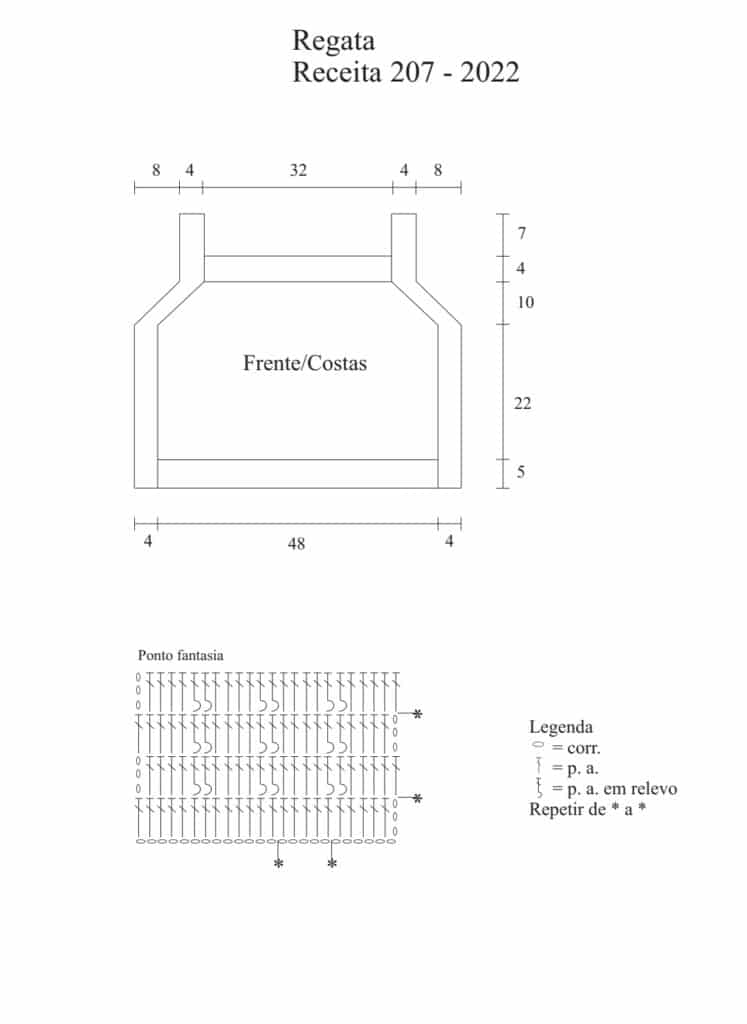 Então, ao mesmo tempo a 27 cm do início do trabalho para as cavas deixe de fazer de cada lado em cada carr.: 2 p. (10 v.). Sendo assim, a 37 cm do início do trabalho passe para o fio Verde-neon e trabalhe em p. fantasia seguindo o gráfico, comece o p. fantasia com 4 p. a. e termine com 4 p. a.. Em seguida, a 41 cm do início do trabalho rem.. Então, com e frente e costas prontas, com o fio verde-neon faça uma corr. de 25 p., na ponta de uma das partes na borda superior (ver molde) e prenda na outra parte. Assim, faça o mesmo trabalho nas duas bordas.