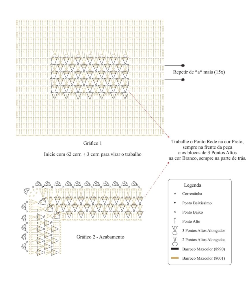 Sendo assim, continue acomp. gráfico 1, trab. em carr. de ida e volta, trab. o Ponto Rede (Preto) sempre na parte da frente da peça, e os bloquinhos de 3 p.a. (Branco) na parte de trás da peça. Assim, rem. o fio Preto e reserve o fio Branco.