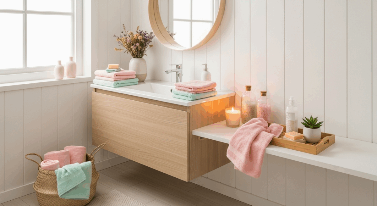 Antes de comprar qualquer coisa, edite o que você tem e meça os pontos críticos: largura útil da circulação, profundidade da bancada e área do box. Com as medidas em mãos, escolha uma paleta curta e quente (off-white amanteigado, areia, café, sálvia) pra unificar o visual e reduzir “ruído”. Garanta ao menos 60 cm livres à frente de cuba e vaso; isso muda a experiência no dia a dia. Em banheiros estreitos, bancada slim de 35–40 cm com cuba de semi-encaixe libera passagem sem sacrificar uso. No box, um painel fixo de vidro transparente em vez de duas folhas correndo deixa a luz circular e amplia o ambiente.