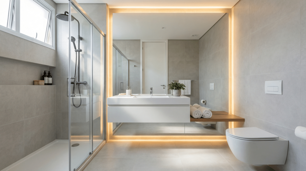 Especialistas em arquitetura de interiores apontam que a fluidez visual é a chave. Quando eliminamos barreiras físicas e visuais, o cérebro interpreta o ambiente como uma área contínua. Se você sente que seu banheiro é apertado, estas estratégias validadas pelo design moderno vão mudar completamente sua percepção de espaço.
