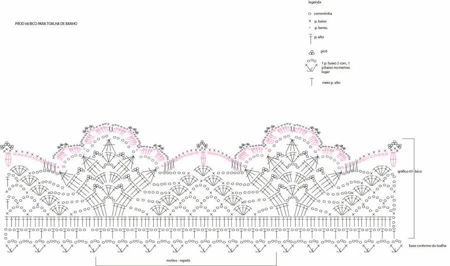 Em seguida, ainda com o fio na cor branca, siga o gráfico 01 em carreiras de ida e volta por sete carreiras. Logo após, troque para o fio Anne na cor rosa, e trabalhe por uma carreira. Por fim, volte ao fio Anne na cor branca e finalize com a última carreira.