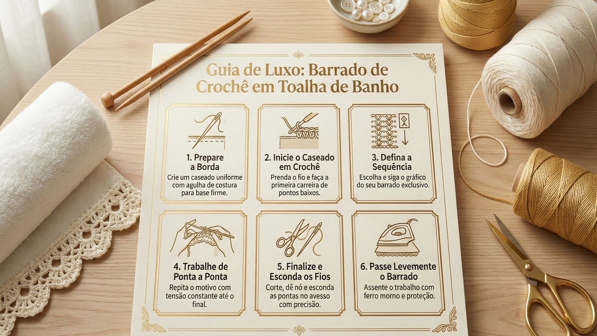 Existem muitas variações de pontos, mas a lógica geral de um barrado de crochê para toalhas de banho costuma seguir alguns passos em comum. Abaixo, um roteiro simples para quem está começando.