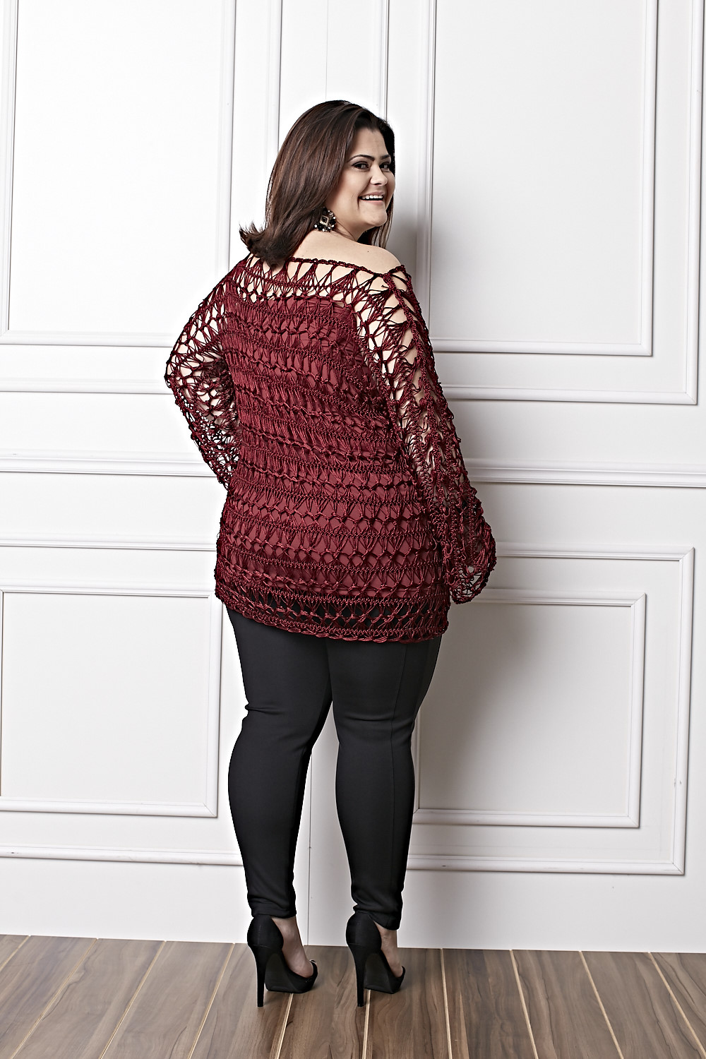 Parte superior e mangas frente e costas – Com o fio Encanto na cor bordô, a agulha de grampo e agulha de crochê de 3,5mm, faça 6 tiras (A) com 216 alças à direita e 216 alças à esquerda da agulha de grampo. Prenda as alças no centro do grampo com pontos baixos. Corpo frente e costas – Com o fio Encanto na cor bordô, a agulha de grampo e agulha de crochê de 3,5mm, faça 8 tiras (B) com 261 alças à direita e 261 alças à esquerda da agulha de grampo. Prenda as alças no centro do grampo com pontos baixos. Montagem e acabamento – faça a união de 6 tiras (A) entrelace as alças de 3 em 3 alças e de 6 em 6 alças. Faça a união da parte superior e mangas frente e costas unindo os 45cm das tiras (A) para formar a parte inferior da manga, na parte superior unir as alças sobre 61cm de cada lado deixando a abertura de 42cm para o decote. Faça a união das 8 tiras (B), entrelace as alças de 3 em 3 alças e de 6 em 6 alças, dobre-as ao meio formando a frente e costas parte inferior da peça. Com a agulha de crochê de 3,5mm e o fio Encanto na cor bordô faça ao redor do decote o bico de acabamento de *1 ponto baixo, 3 correntinhas*, repita de *a* a volta toda e feche a carreira com 1 ponto baixíssimo. Ao redor kdos punhos faça uma carreira de ponto baixo.