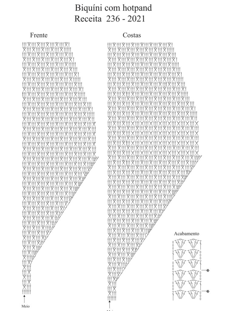 Calcinha – Frente – Primeiramente, faça uma corr. de 11 p. e trabalhe do seguinte modo: os 6 primeiros p. (conte a corr. como 1 p.) do acabamento seguindo o gráfico, os p. em p. fantasia seguindo o gráfico da frente (trabalhe o gráfico espelhado a partir do meio indicado com a seta) e os últimos 6 p. do acabamento seguindo o gráfico. Assim, trabalhe em toda a lateral do gráfico o acabamento conforme indicado no início. Então, terminado o gráfico da frente, rem.. Assim, trabalhe nas duas laterais após os aum. das cavas do seguinte modo: os 6 primeiros p. (conte a corr. como 1 p.) do acabamento seguindo o gráfico e 56 p. a.. Então, trabalhe o p. do acabamento do lado das cavas. Assim, trabalhe 16 carr. e rem..