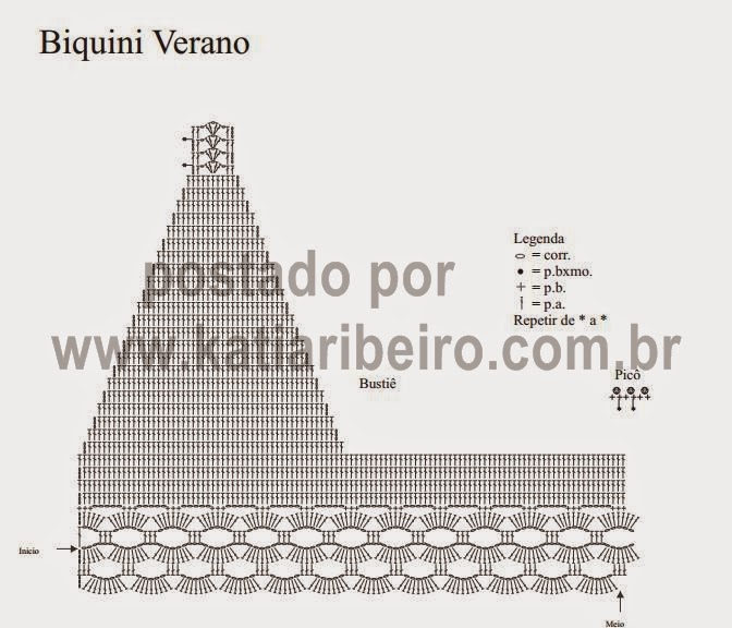 Correntinha (corr.). Ponto baixíssimo (p.bxmo.): Introduza a ag., laç., puxe o p. e passe diretamente no p. da ag.. Ponto baixo (p.b.): introduza a ag., laç., puxe o p. e com outra laç., rem. todos os p.. Ponto alto (p.a.): laç., introduza a ag., laç., puxe o p. laç., rem., 2 p. e com outra laç., rem. todos os p.. Calça frente/costas: siga o gráfico correspondente. Bustiê: siga o gráfico. Picô: siga o gráfico.
