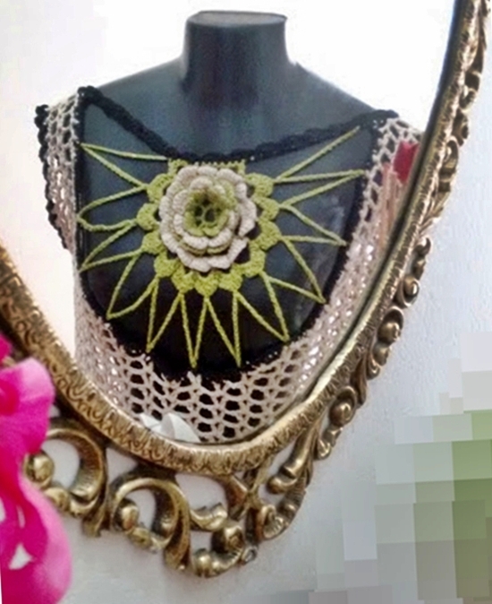 Fiz com os fios Cléa 5 ( duplo ) e a flor foi feita com Anne brilho ( que deu um ar muito chique à produção ) , ambos da Círculo S/A .