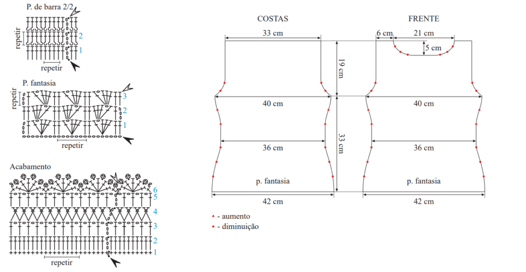 • Trab. 96 p. de barra 2/2 ao redor do decote por