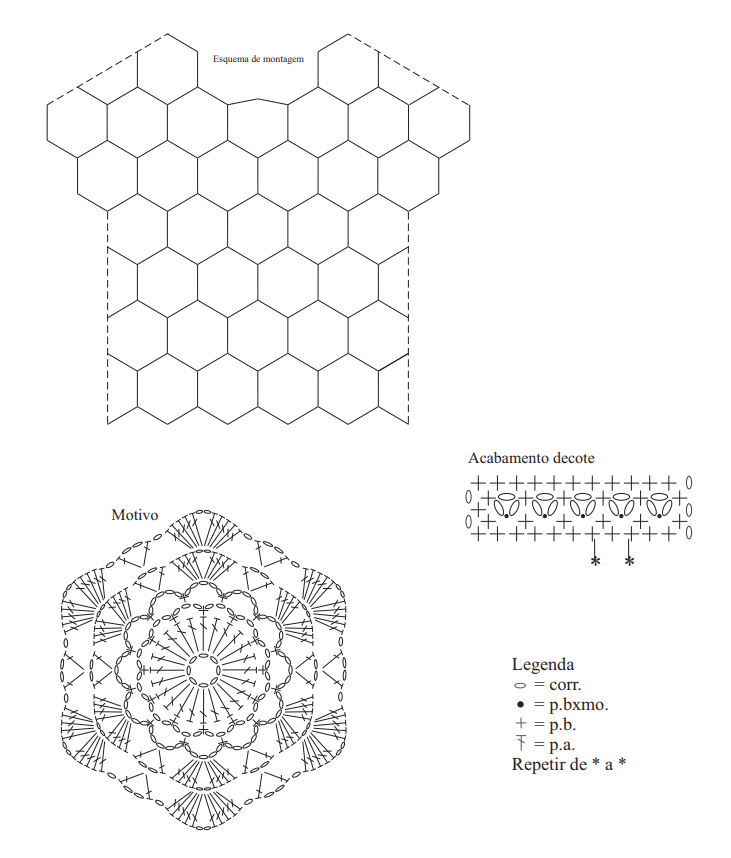 Frente/costas e mengas – São trabalhadas juntas e em motivos. Motivo – Faça uma corr. de 8 p. feche em círculo e trabalhe o motivo seguindo o gráfico. Terminado o gráfico rem.. Faça 72 motivos iguais unindo-os entre si durante a última carr. seguindo o esquema de montagem. As linhas pontilhadas no esquema de montagem são as dobras dos motivos.