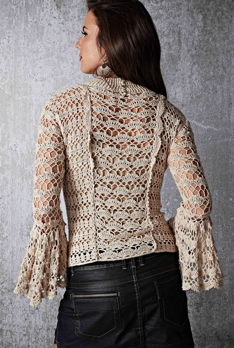 Peça (A) – Use a ag. de crochê de 2mm e o fio Estilo na cor bege e inicie a peça com um cordão de 28cm em corr., sobre este cordão trab. no p. fantasia (A) acompanhando o diag. 1 e os pts. de rep.. À 29cm de comprimento desde o inicio forme as cavas rem. os 6cm centrais. À 45cm de comprimento desde o inicio rem. o fio. Trab. em carr. de ida e volta. Faça a outra peça igual e reserve-as. Peça (B) – Use a ag. de crochê de 2mm e o fio Estilo na cor bege e inicie a peça com um cordão de 15cm em corr., sobre este cordão trab. no p. fantasia (B) acompanhando o diag. 2 e os pts. de rep.. À 45cm de comprimento desde o inicio rem.. Trab. em carr. de ida e volta.. Faça a outra peça igual e reserve-as. Manga – Use a ag. de crochê de 2mm e o fio Estilo na cor bege e inicie a peça com um cordão de 20cm em corr., sobre este cordão trab. no p. fantasia (B) acompanhando o diag. 2 e os pts. de rep. e o molde. À 32cm de comprimento desde o inicio rem. o fio. Trab. em carr. de ida e volta. Faça a outra manga igual e reserve-as. Montagem e acabamento – Use a ag. de tapeçaria e o fio Estilo na cor bege e costure as peças em p. de alinhavo a mão. Dobre as peças (A) ao meio formando as laterais de cada frente e da parte das costas, como entremeio das peças (A) costure as peças (B). Feche os ombros (10cm), feche a manga e costure-as ao redor das cavas. Babado da manga – Use a ag. de crochê de 2mm e o fio Estilo na cor bege unir o fio no cordão inicial da manga de 20cm e trab. acompanhando o diag.3 e o pts. de rep. da 1ª até a 19ª carr.. Trab. em carr. circulares e feche as carr. com p.bx. e m.p.a. Gola – Use a ag. de crochê de 2mm e o fio Estilo na cor bege unir o fio na parte central das costas e trab. em p. de barra 1/1 acompanhando o diag. 4 e os pts. de rep.. Trab. em carr. de ida e volta. À 6cm de comprimento desde o inicio rem. o fio. No decote na parte das costas prenda os 3 botões. Acabamento em relevo – Use a ag. de crochê de 2mm e o fio Estilo na cor bege e trab. em relevo sobre as peças (B) em cada lateral o babado que são 5 bicos da (1ª, 2ª e 3ª carr. do diag. 2). Na parte inferior do babado anterior trab. o bico de acabamento acompanhando o diag. 5 e o p. de rep.