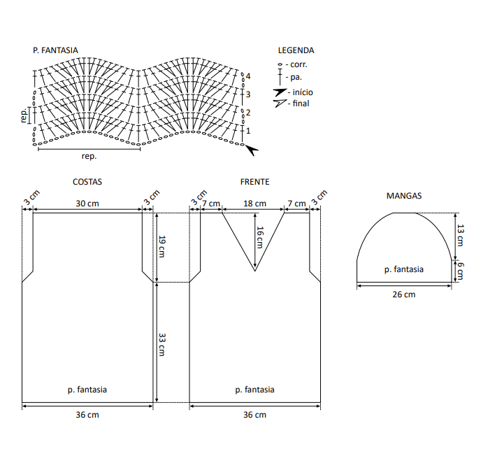COSTAS – faça 77 corr., mais 3 corr. para subir a carr., trab. em p. fantasia acompanhando o molde da blusa para realizar as diminuições necessárias para a formação das cavas.