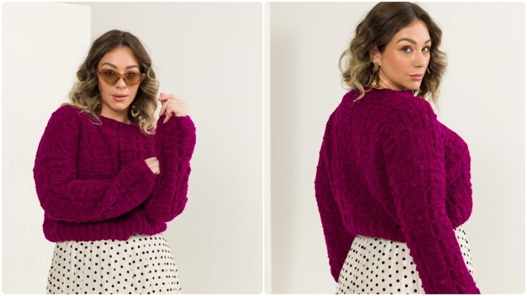 Na produção da blusa, diferentes pontos e técnicas são utilizados para criar texturas e efeitos visuais marcantes, oferecendo um ótimo desafio para quem possui experiência no tricô. Entre eles, destacam-se o ponto fantasia, a barra 2/2, além de detalhes em ponto pipoca, que requerem atenção e precisão durante a execução. Cada parte da blusa – costas, frente, mangas e gola – é trabalhada separadamente em carreiras de ida e volta, o que demanda organização e controle na contagem dos pontos.