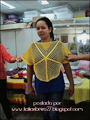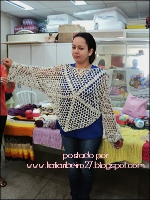 Hoje vim mostrar a blusa maravilhosa e super fácil que a minha amiga artesã Noemi Fonseca apresentou hoje no programa Arte Brasil, uma peça que uma iniciante facilmente conseguirá executar, quando ela esteve aqui em Sorocaba num Workshop tive a oportunidade de ver esta peça de perto e ainda melhor, com ela você poderá fazer outros trabalhos, veja também as outras idéias que postei aqui para você com o mesmo gráfico, fala se não é demais!!!!