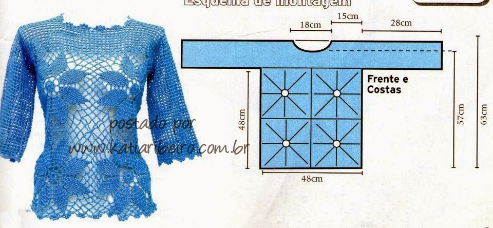 ESQUEMA DE MONTAGEM E GRÁFICO DA BLUSA EM CROCHÊ