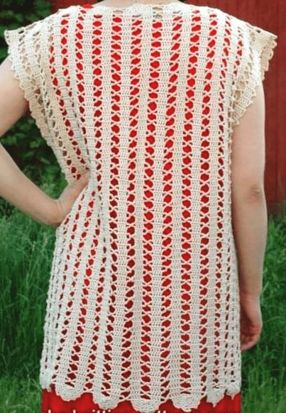 A transparência estratégica, característica do crochê de Bruges, adiciona um toque de sensualidade à peça sem comprometer a elegância. Os jogos de sombra e luz revelam a pele de maneira sutil, criando um visual cativante.