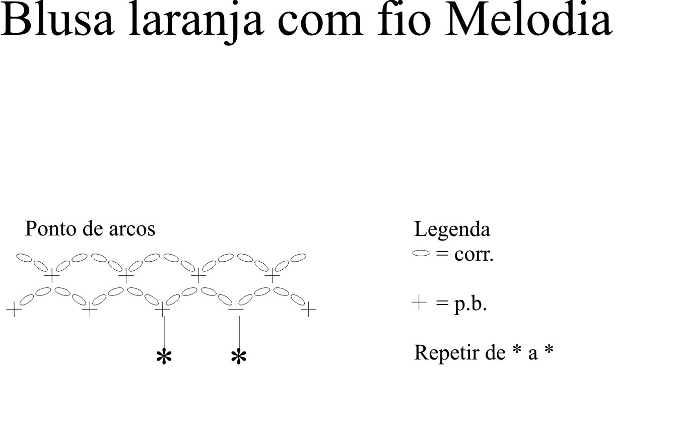 Correntinha (corr.). Ponto baixo (p.b.): introduza a ag., laç., puxe o p. e com outra laç., rem. todos os p.. Ponto segredo:1ª carr.: 1 p. b. no p. de base, * ºº alongue o p. da ag. (em mais ou menos 1 cm), laç., puxe o p., introduza a ag. entre o fio da esquerda e os dois fios da direita (do p. alongado), laç., puxe o p., laç., rem. os 2 p. da ag.ºº repita de ºº a ºº mais uma vez, pule 3 p. de base, 1 p.b. no p. seguinte*. 2ª carr. e seguintes: faça 3 pétalas para iniciar a carr., 1 p.b. no p. central entre as 2 pétalas, * ºº alongue o p. da ag. (em mais ou menos 1 cm), laç., puxe o p., introduza a ag. entre o fio da esquerda e os dois fios da direita (do p. alongado), laç., puxe o p., laç., rem. os 2 p. da ag.ºº repita de ºº a ºº mais uma vez, 1 p.b. no p. central entre as 2 pétalas da carr. anterior *. Ponto de arcos: siga o gráfico.