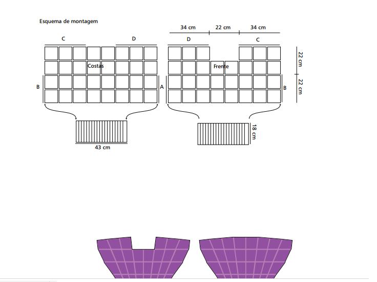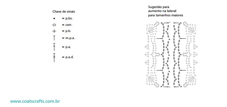 •Dica – Para outros tamanhos: não feche as laterais nem os ombros. Meça o quanto você precisa aumentarem cada lateral, divida ao meio e trab. carr. de arcos de corr. nessa medida em cada lateral da peça (sobre os 4 motivos da lateral) e una-as com p.bx. pelos arcos da última carr. como mostra o diagrama de sugestão. Trab.de forma similar nos ombros. Se você quiser uma blusa mais comprida, faça mais um motivo na altura. Isso aumentará a peça em cerca de 11 cm.