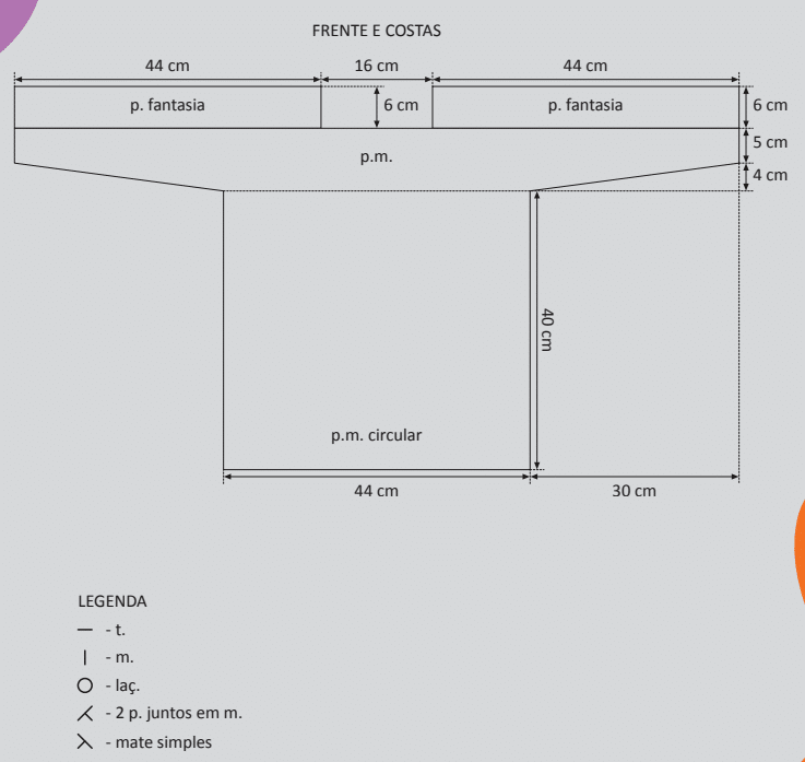 meia; m. torcido; t. = tricô; j. = junto(s); laç. = laçada; p.m. = direito em m.,