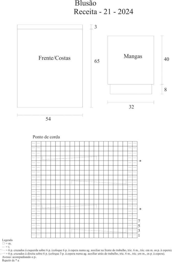 Costas – Monte 70 p. nas ag. nº 5,0mm e tric. em p. meia. A 65 cm do início do trabalho tric. em barra 2/2. A 68 cm do início do trabalho rem. Frente – Monte 84 p. nas ag. nº 5,0mm e tric. do seguinte modo: 1 p. de borda, 30 p. em p. fantasia, 22 p. em p. de corda, 30 p. em p. fantasia, 1 p. de borda. A 65 cm do início do trabalho tric. em todos os p. em barra 2/2. A 68 cm do início do trabalho rem. Mangas – Monte 52 p. nas ag. nº 5,0mm e tric. em barra 2/2. A 8 cm do início do trabalho tric. do seguinte modo: 1 p. de borda, 14 p. em p. fantasia, 22 p. em p. de corda, 14 p. em p. fantasia, 1 p. de borda. A 48 cm do início do trabalho rem.