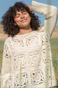 - Blusa com Crochê Irlandês: Misturando motivos florais e folhas, esse modelo é considerado uma verdadeira obra de arte.