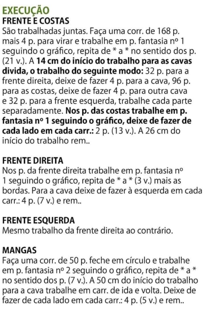 - Segundo passo: Siga o diagrama principal em carreiras circulares, mantendo os mesmos pontos da blusa. Faça alguns aumentos nos primeiros 40cm e reduções nos últimos 8cm de comprimento.