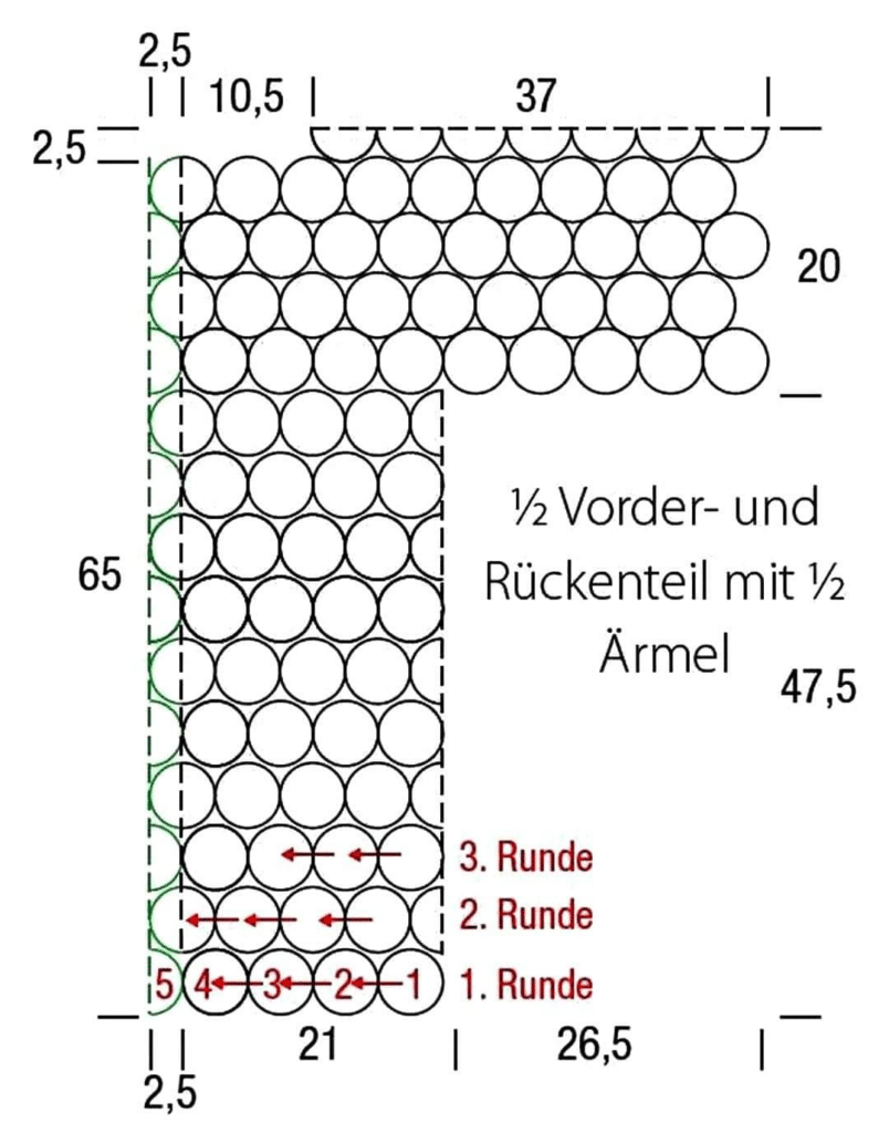 - Ao redor do início da peça, faça 2 carreiras em ponto baixo e remate.