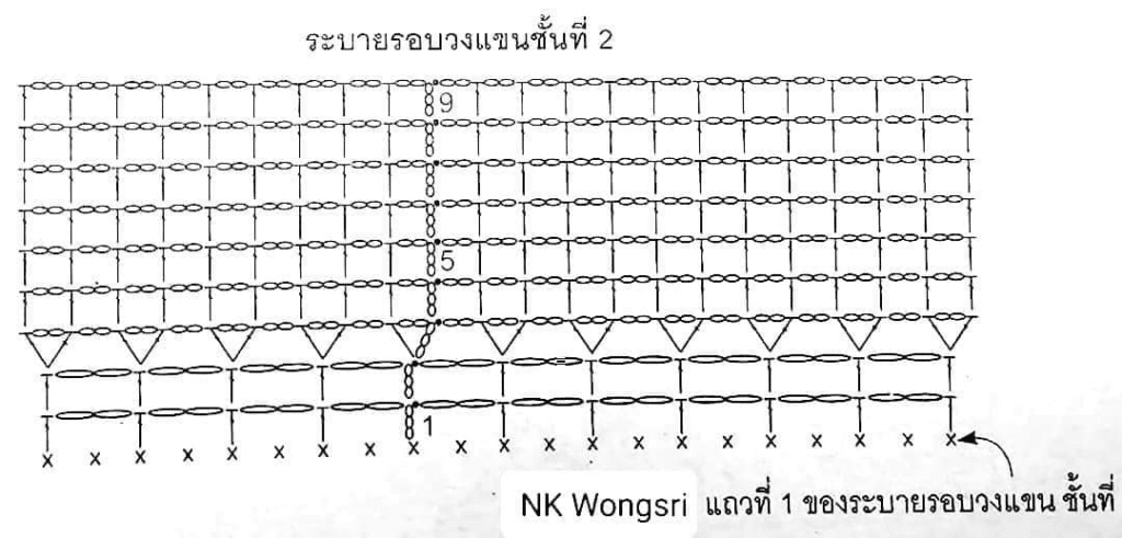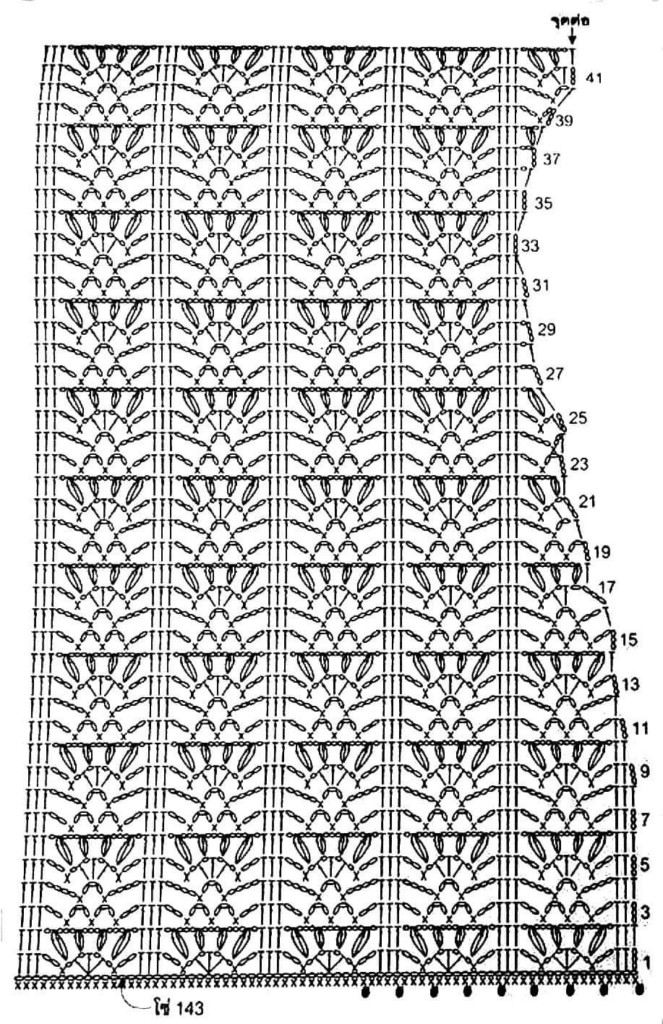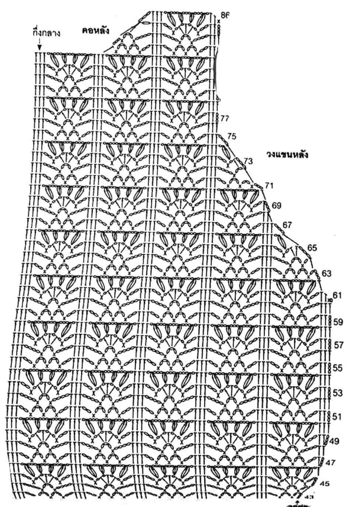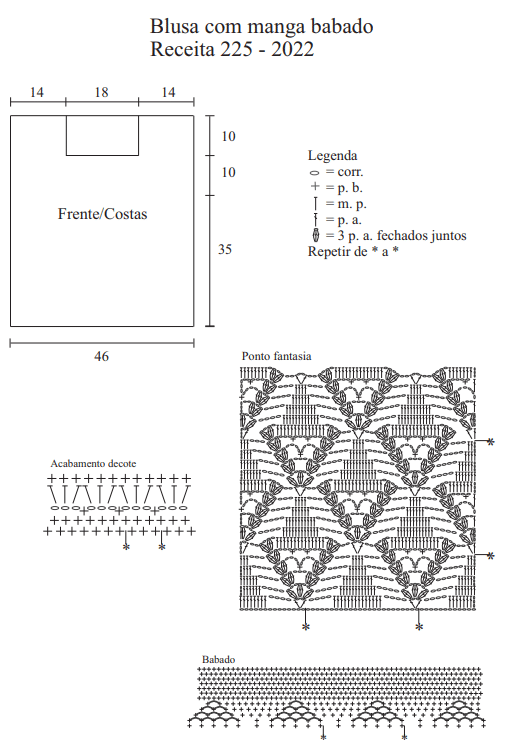 - Trabalhe em círculo, ao redor das cavas, o babado seguindo o gráfico, repetindo de * a * no sentido dos pontos (10 vezes). Ao finalizar o gráfico, remate.